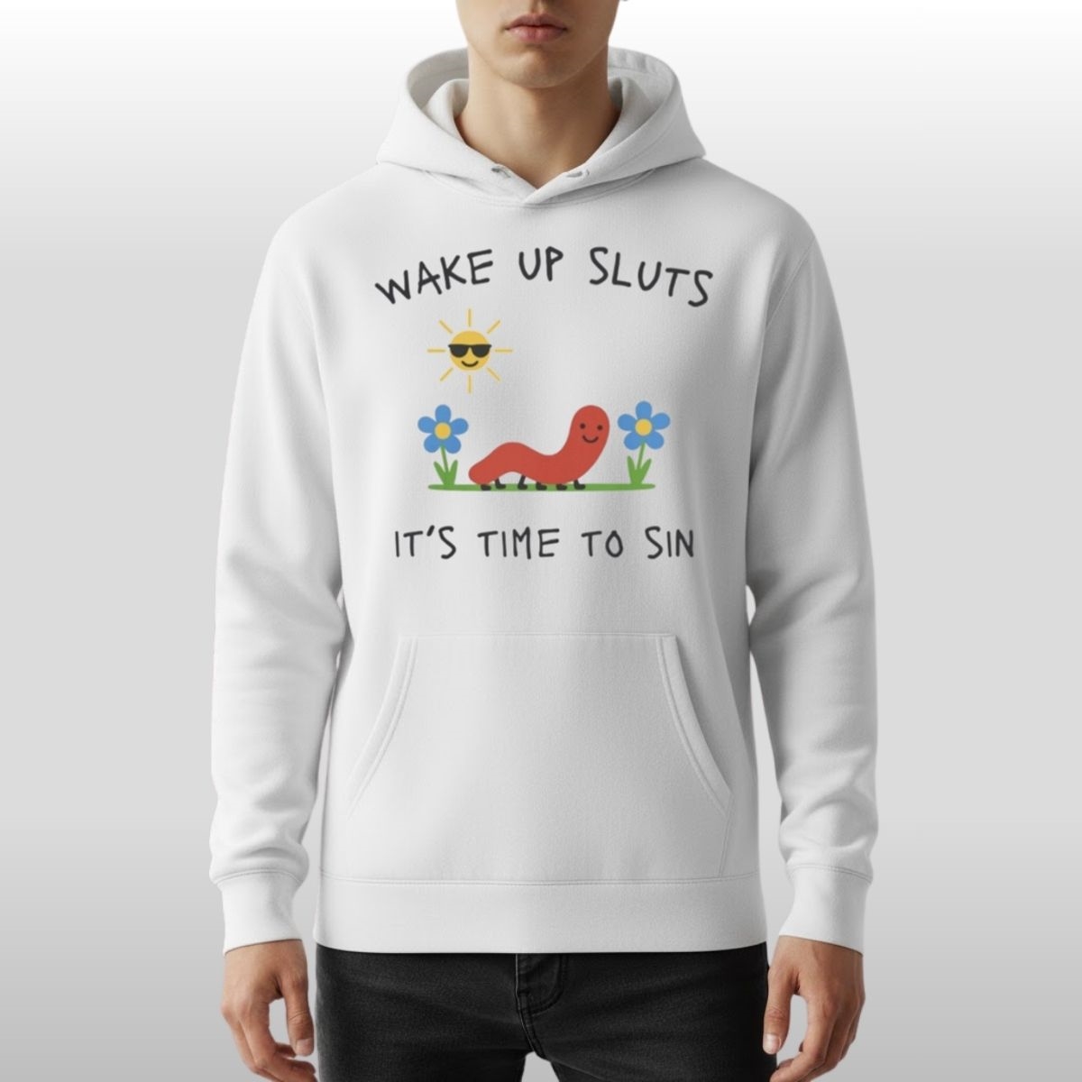 The design itself is a masterclass in visual juxtaposition. The centerpiece features a friendly, undulating worm basking under a wearing-sunglasses sun, surrounded by simple floral motifs that look like they were plucked straight from a vintage children’s book. However, the bold, hand-drawn typography framing the scene delivers a witty punchline that flips the innocent imagery on its head. This contrast creates a unique “anti-fashion” energy, making it a favorite for individuals who value self-expression that feels both playful and unapologetically edgy.