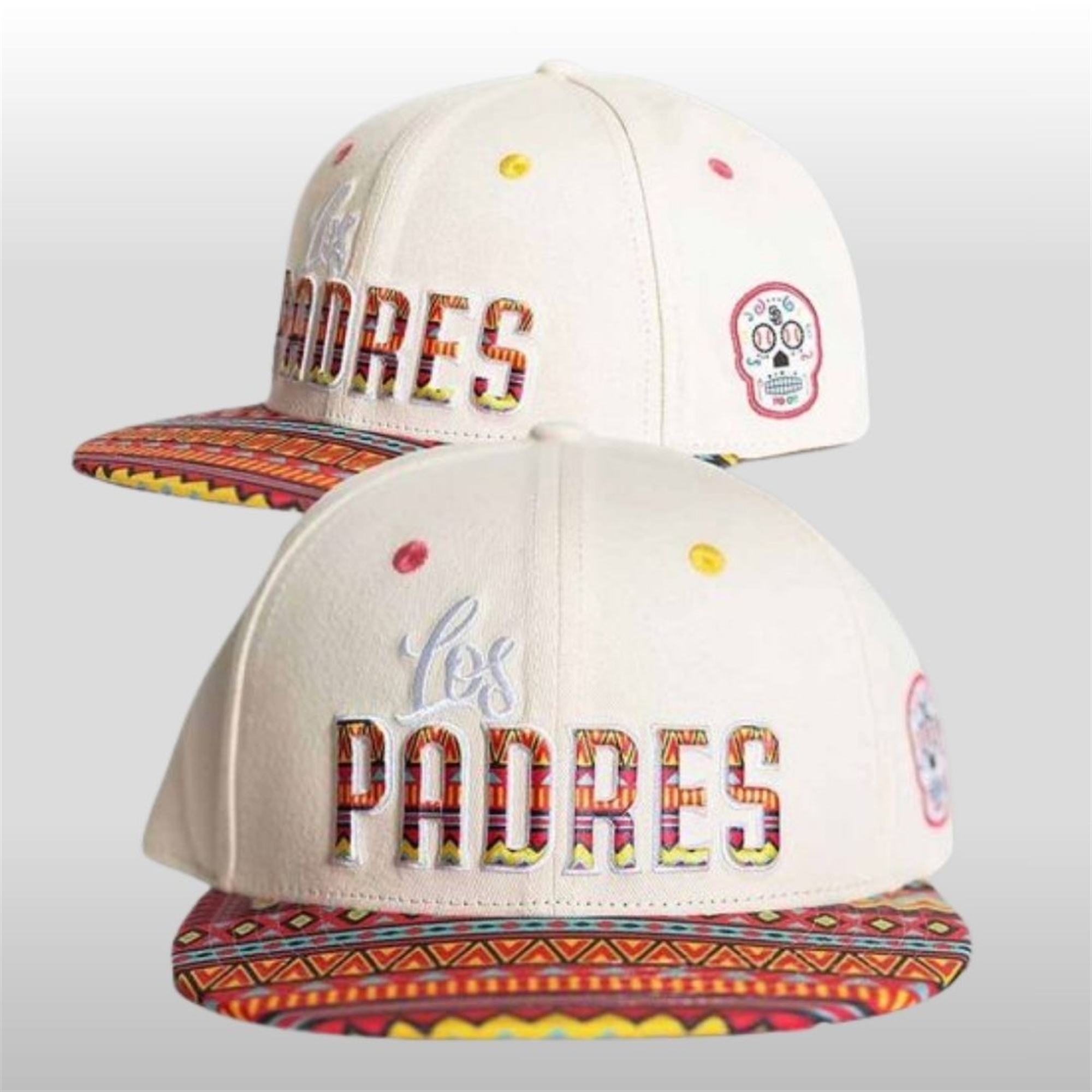 The Padres Hispanic Heritage Celebration Hat 2025 Giveaway is a stylish, cream-colored, flat-brimmed cap that immediately stands out. It features the bold, eye-catching phrase “Los PADRES” embroidered prominently on the front. The letters are filled with a vibrant, multi-colored pattern inspired by traditional indigenous textile designs, giving the hat a unique, festive look.