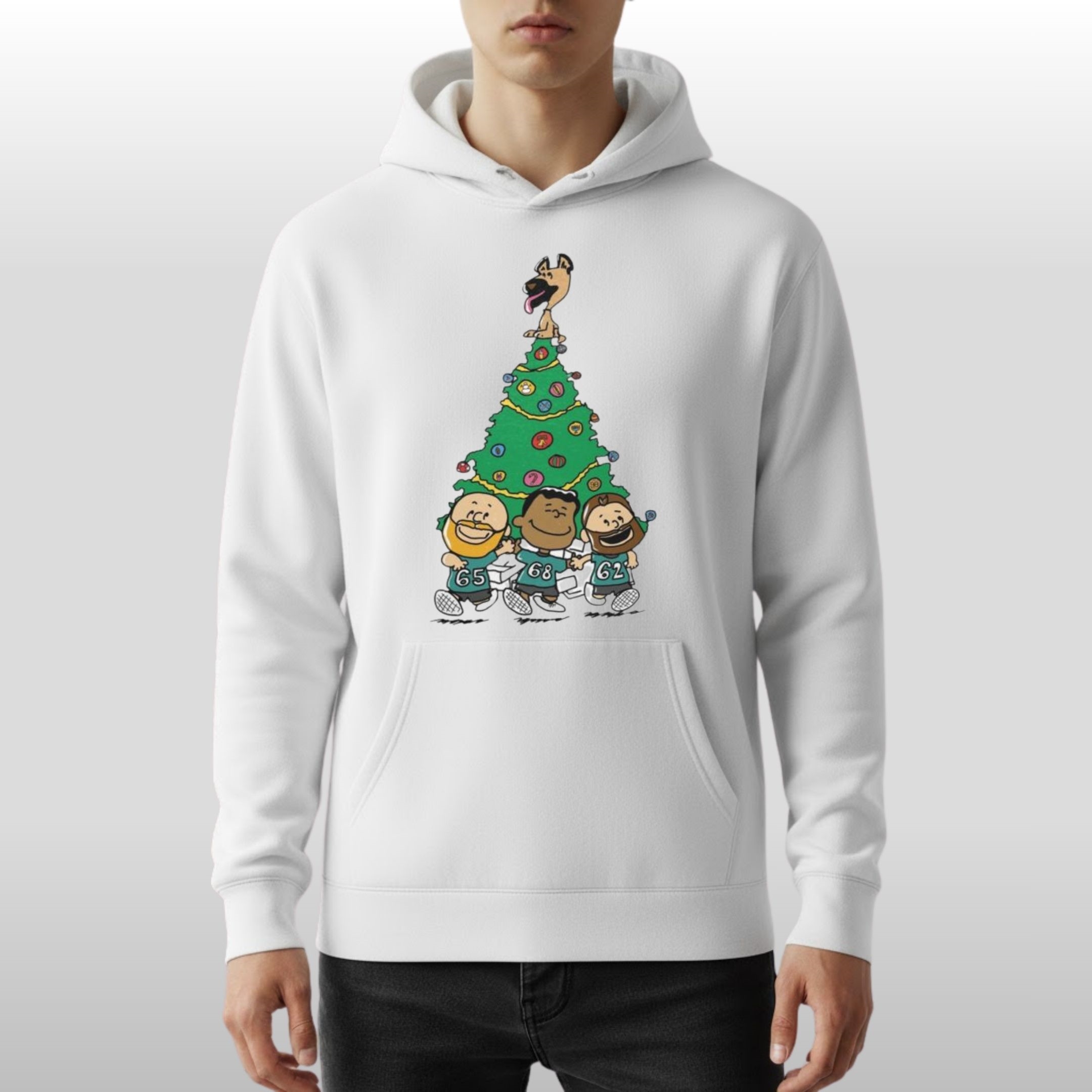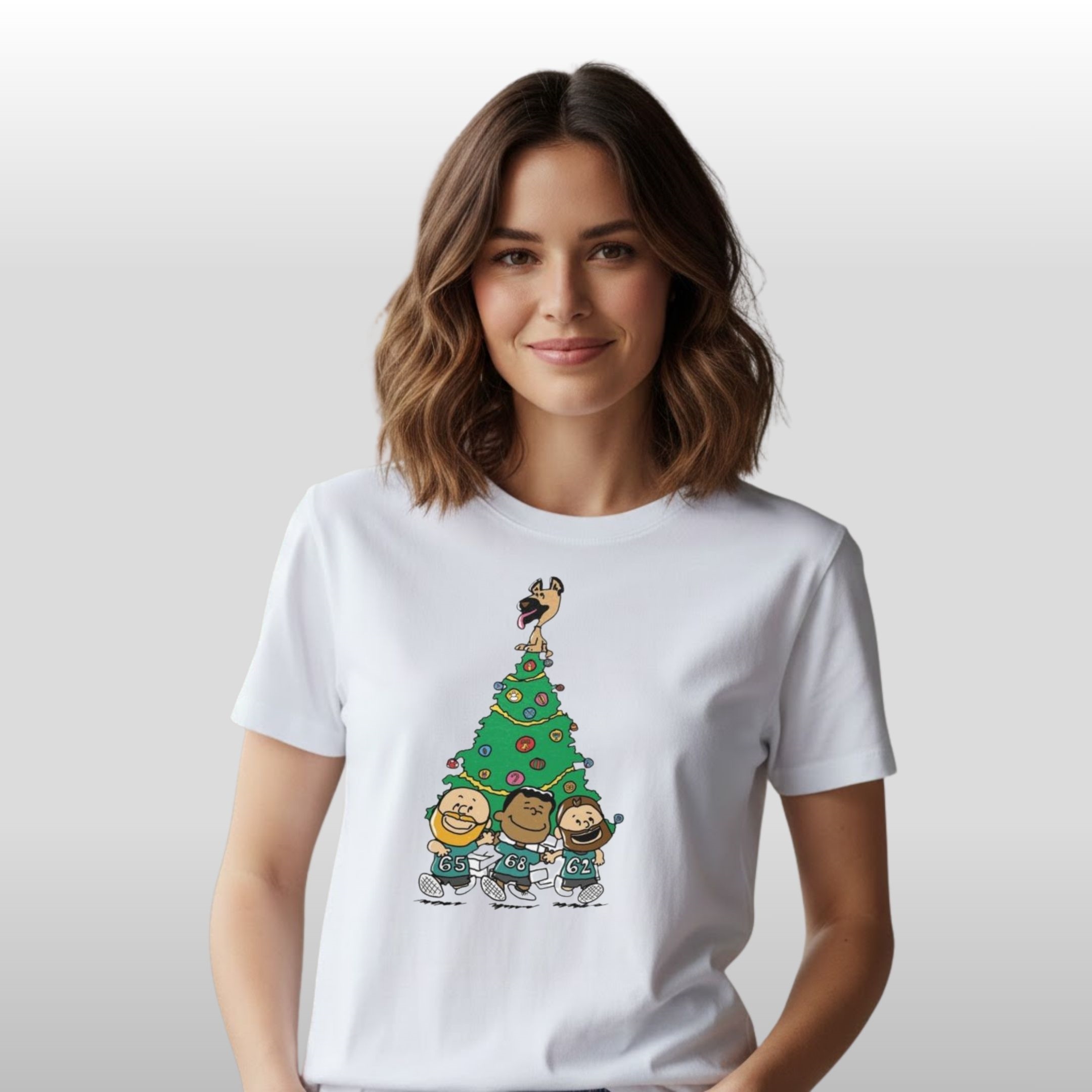 Celebrate the most wonderful time of the year with the spirited Philadelphia Eagles 2026 Christmas Shirt. This white, high-quality tee features a heartwarming and fun graphic perfect for any fan. The design showcases three beloved Eagles-inspired characters, illustrated in a charming, cartoon style, forming a festive Christmas tree. These characters, wearing iconic green and white jerseys and running with excitement, represent the dynamic energy of the team. Topping the cheerful ‘tree’ is a playful, smiling dog, bringing an extra layer of joyful, quirky appeal.