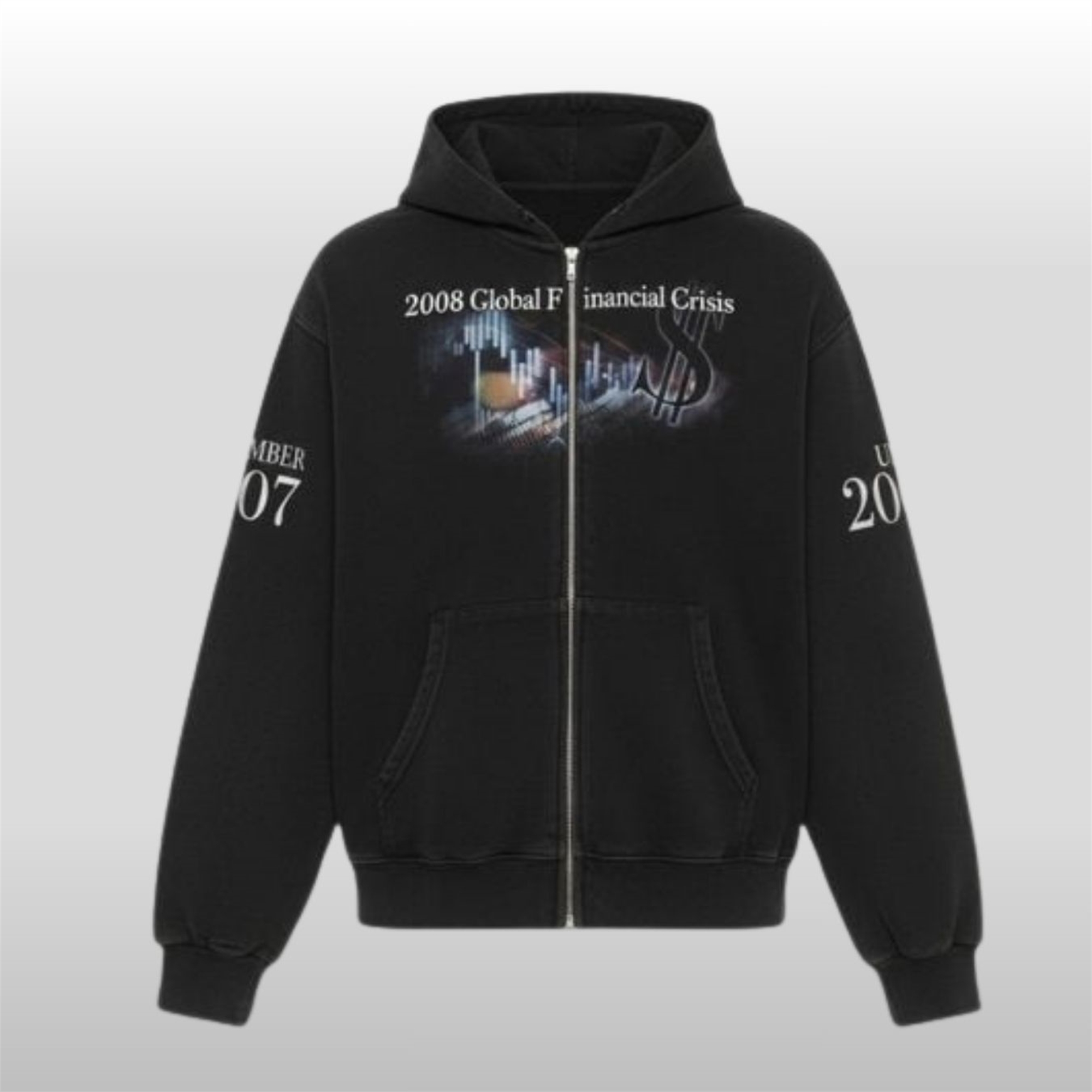 The Rob Dillingham 2008 Global Financial Crisis Hoodie is a premium, heavy-weight black zip-up designed for comfort and maximum visual impact. The centerpiece of this striking garment is a distressed graphic representing the 2008 Global Financial Crisis-inspired apparel, featuring a dark, moody rendering of stock market charts and a looming dollar sign, symbolizing the market’s volatility during that time. Text above the graphic clearly states “2008 Global Financial Crisis.” The sleeves are boldly marked with “MBER 07” and “U 20,” evocative of the dates and periods surrounding the event’s peak. Crafted for those who appreciate history and bold street style, this piece delivers a powerful message.