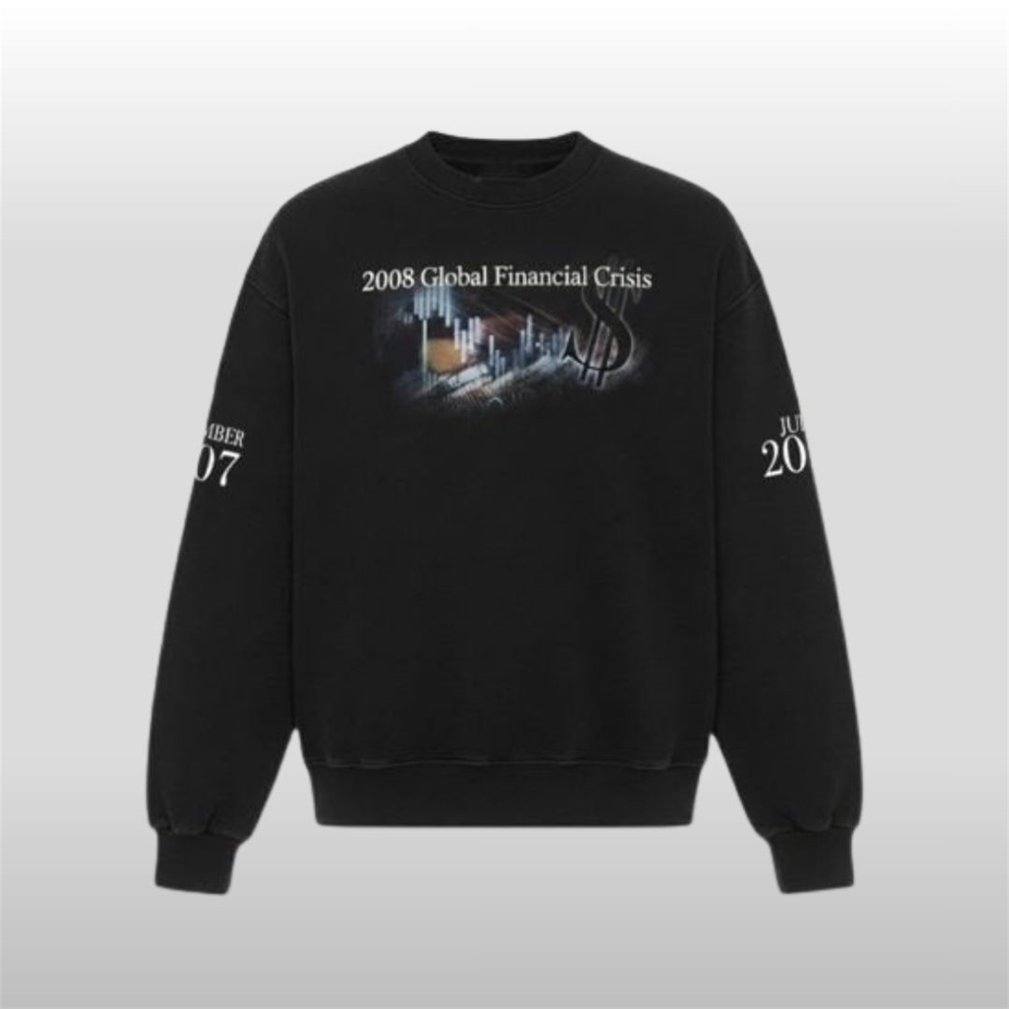 The Rob Dillingham 2008 Global Financial Crisis Sweatshirt offers a striking black canvas for a powerful graphic statement. Across the chest, the phrase “2008 Global Financial Crisis” sits above a distressed image blending stock market graphs—specifically, candlestick charts—with dollar signs, symbolizing the market volatility and economic turbulence of that era.