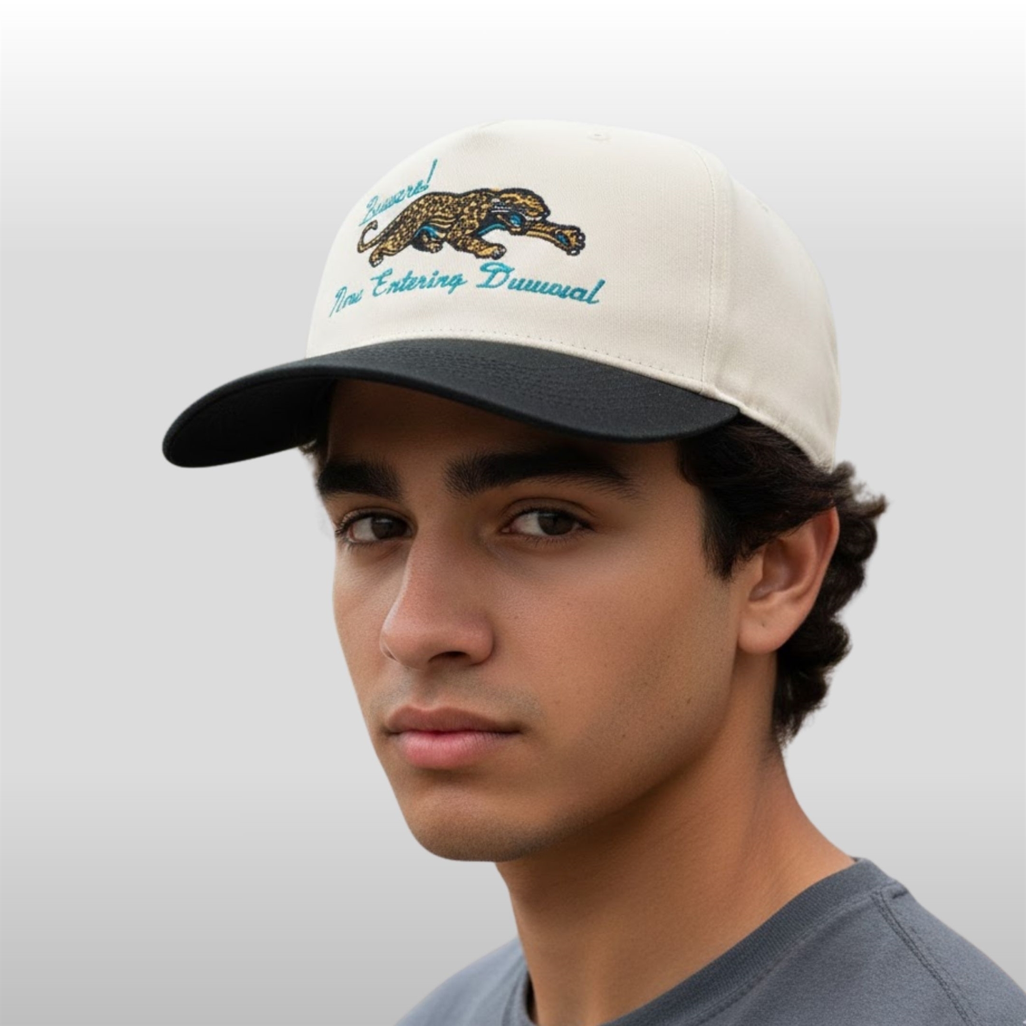 When Robert Hainsey joined the fold, he embraced the “Duuuval” culture immediately. This hat captures that transition, blending a vintage Florida aesthetic with the fierce competitive spirit. Featuring a classic, retro-style crawling jaguar and stylized “Beware! Now Entering Duuuval” embroidery, this piece mirrors the “old school” toughness required to protect the pocket and dominate the AFC South.
