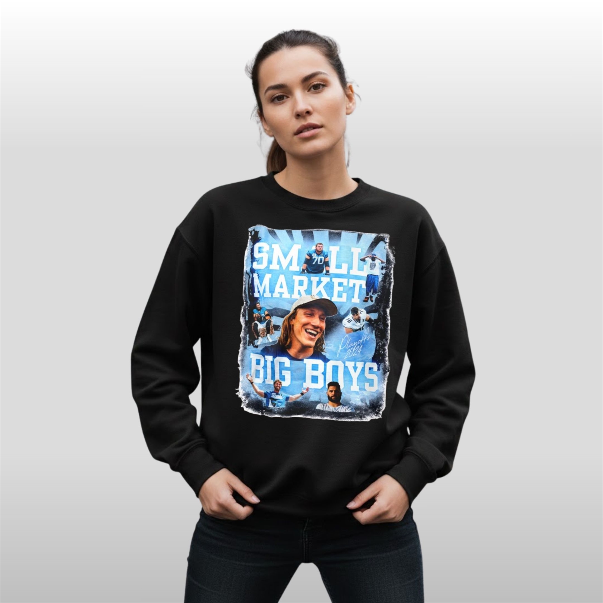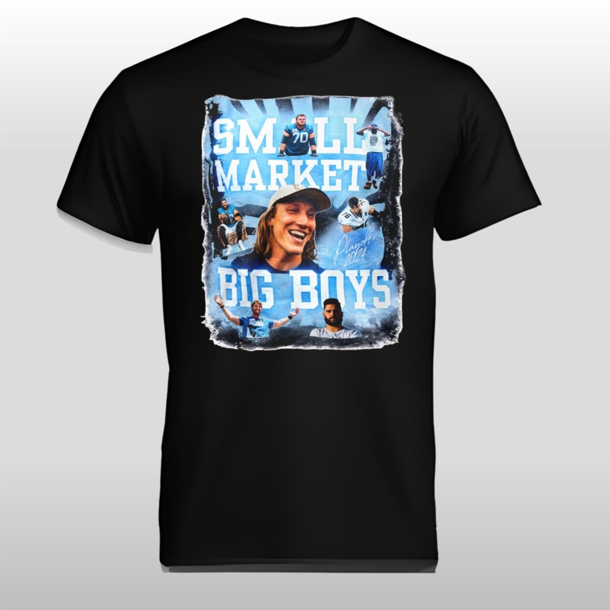 The “Small Market Big Boys” concept has quickly become a fan favorite, trending among the Jacksonville faithful for its authentic, underdog-turned-contender vibe. This garment combines iconic team imagery with a bold, “Heritage-meets-Hype” look—pairing classic teal and black tones with gritty, high-contrast typography. It’s a durable piece of fan history that celebrates the current golden era of Jacksonville football.