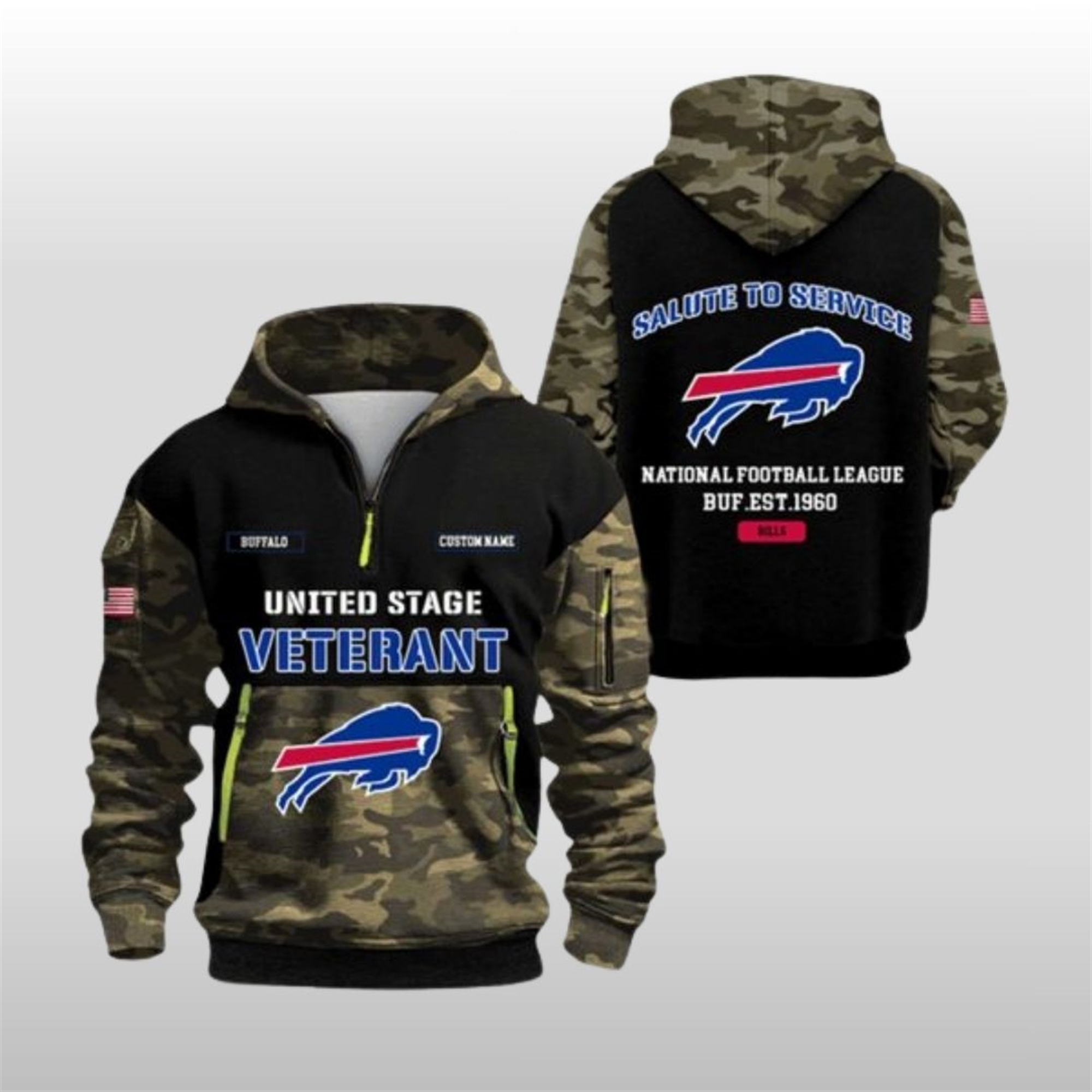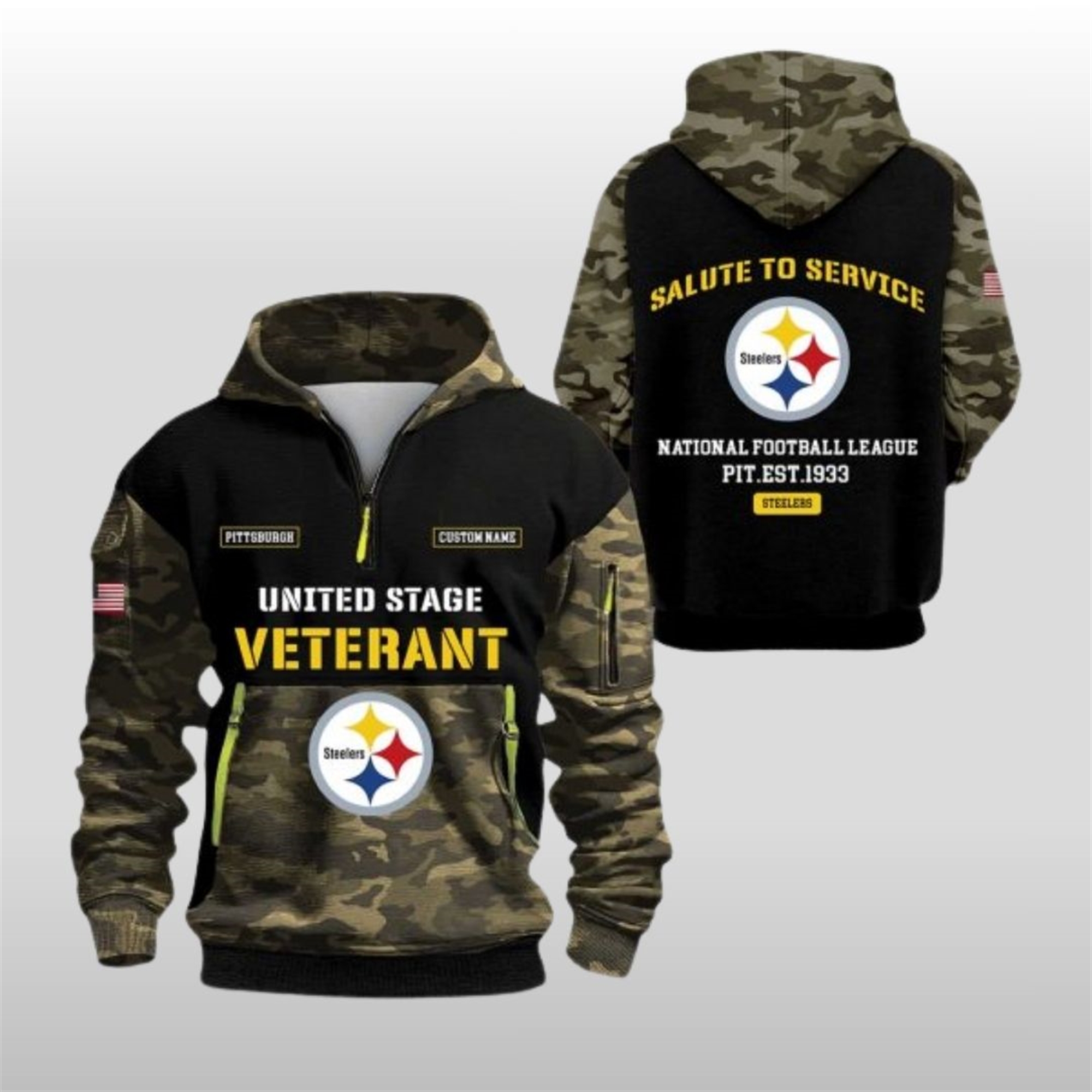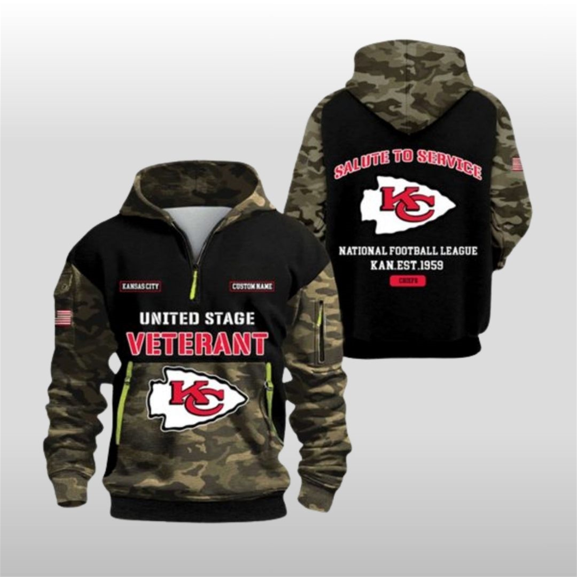 Each Salute To Service 2025 Quarter Zip Hoodie features a striking, military-inspired camouflage pattern across the sleeves, hood, and lower front—a design choice that immediately sets it apart. The main body of the jacket is black, providing a bold canvas for the team’s city name, an optional “CUSTOM NAME” space, and the prominent phrase “UNITED STATE VETERAN” displayed in vibrant team colors. Your chosen team’s primary logo rests on the lower front, with an American flag patch proudly stitched on the sleeve.