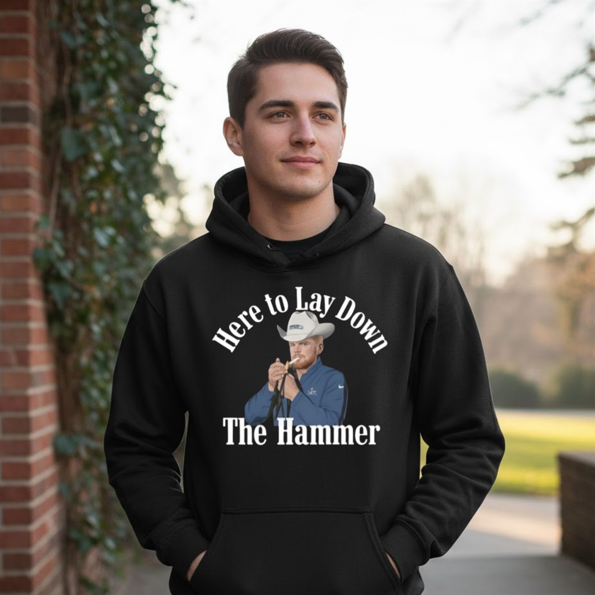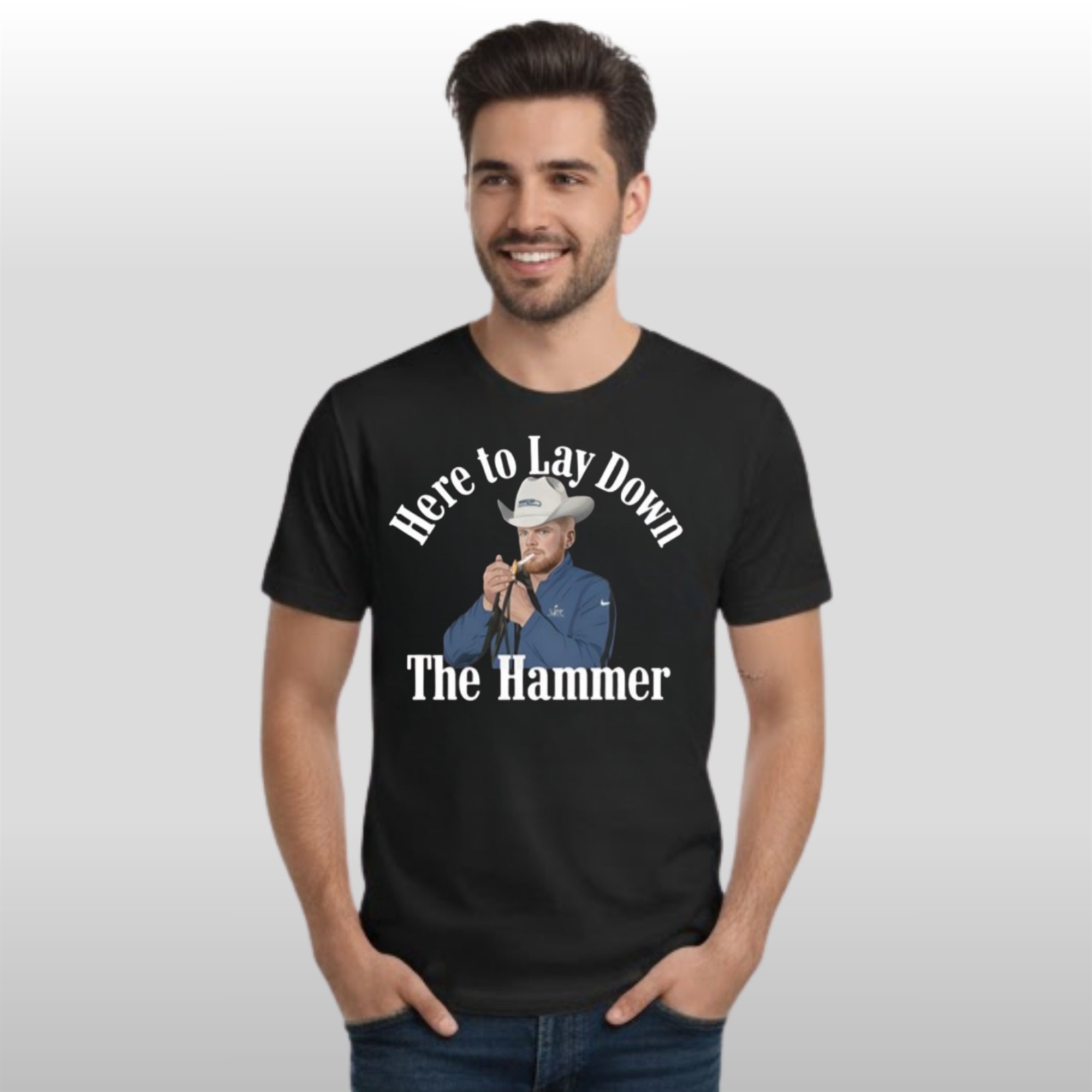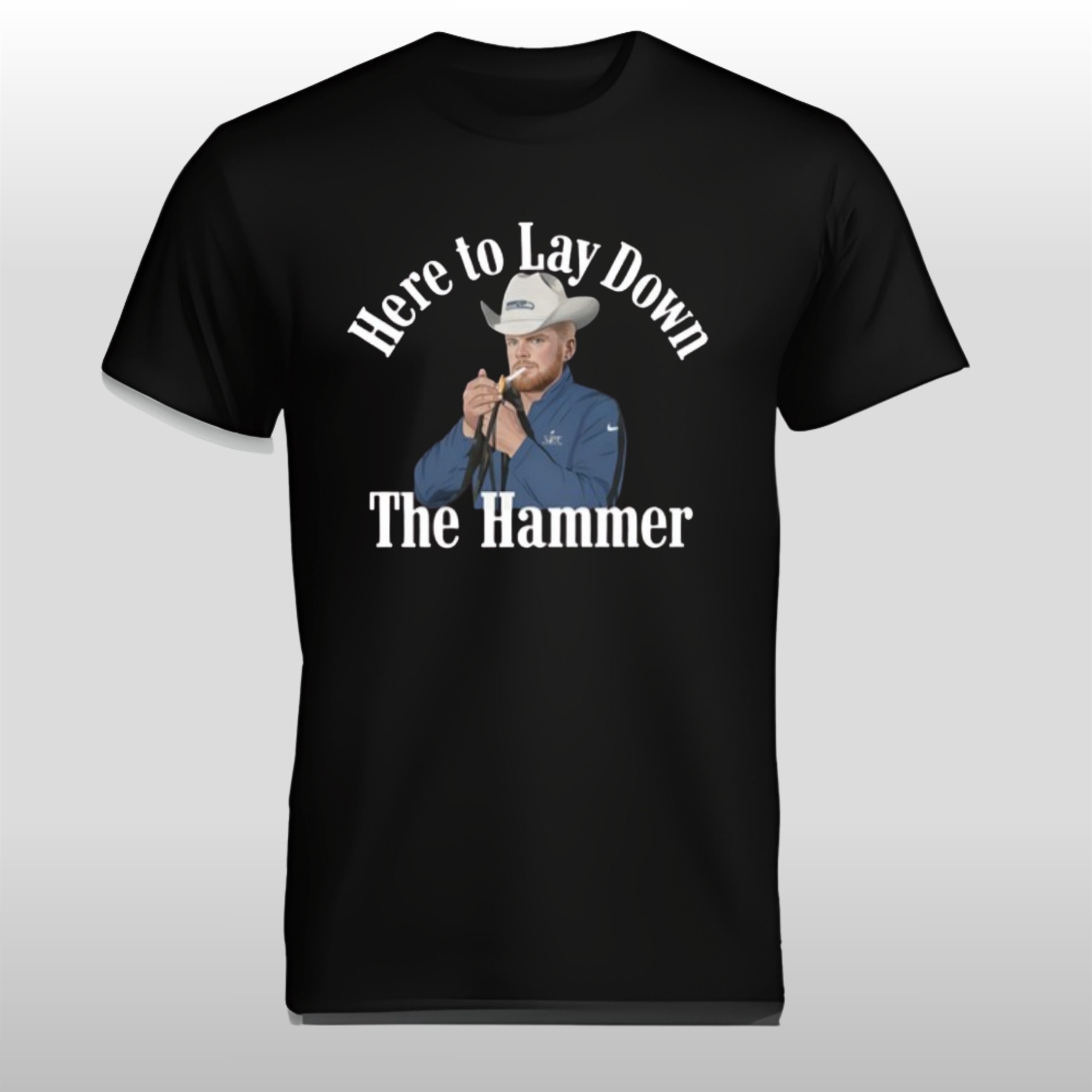 The design of the shirt is as bold as a goal-line stand. Featuring a high-contrast graphic of the quarterback in a classic “ready for battle” pose, the shirt uses a minimalist color palette that emphasizes strength and focus. The “Here To Lay Down The Hammer” typography is rendered in a heavy, industrial font, mirroring the physical nature of the game and the impact of every decisive throw.