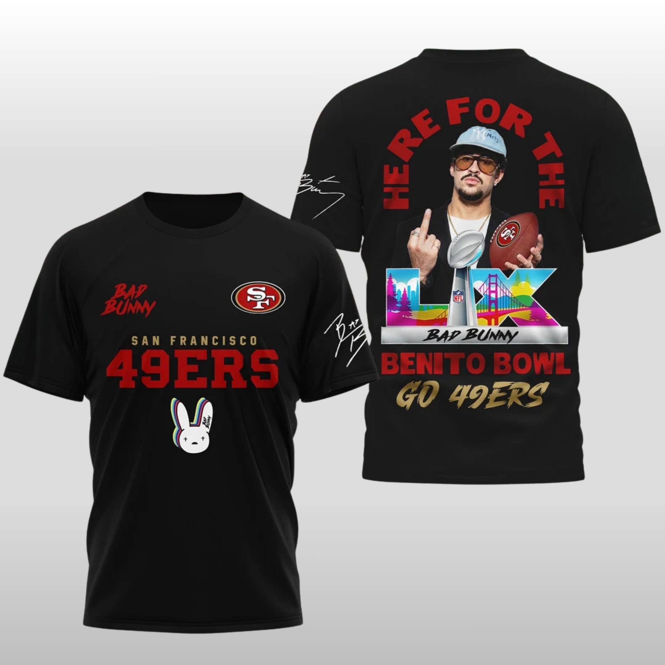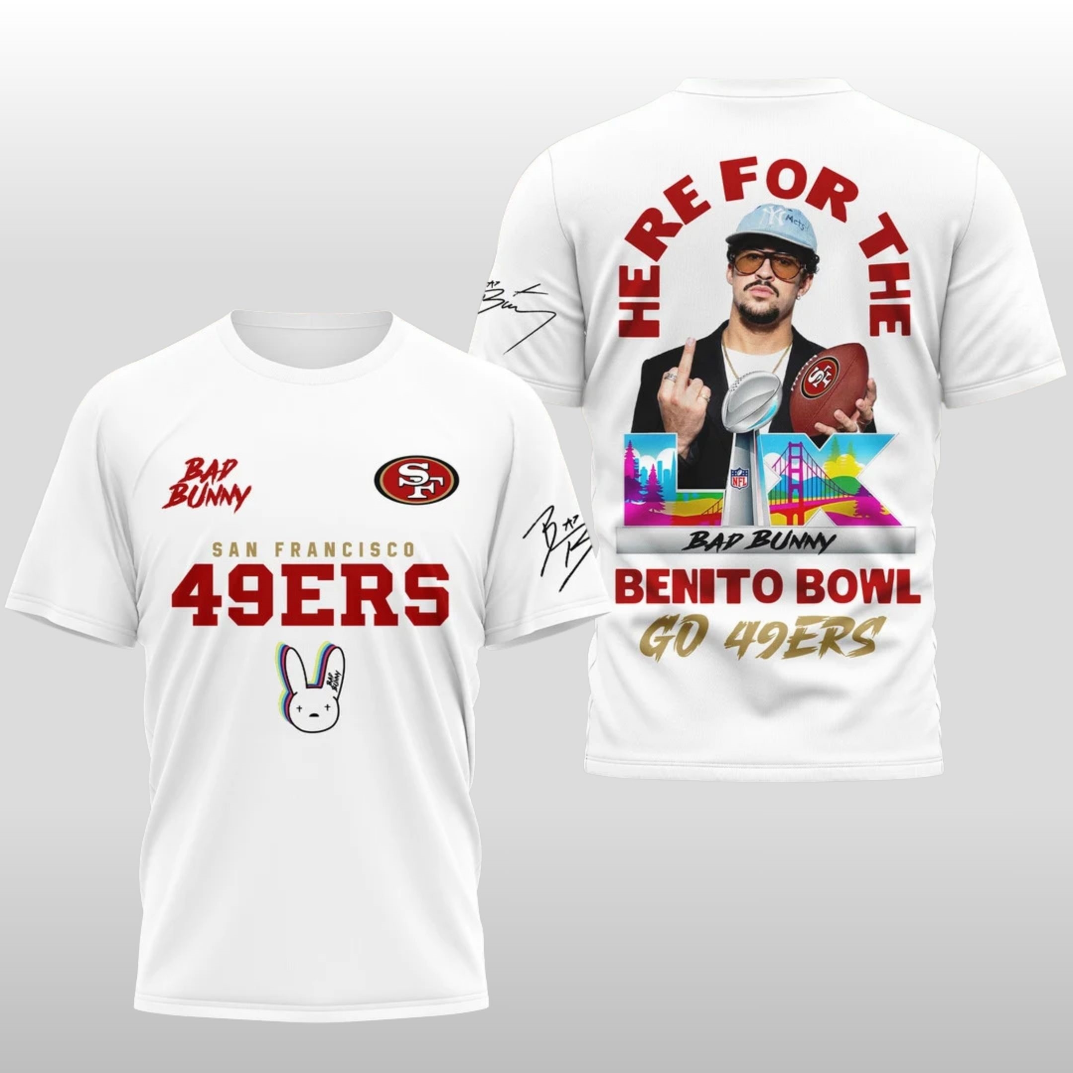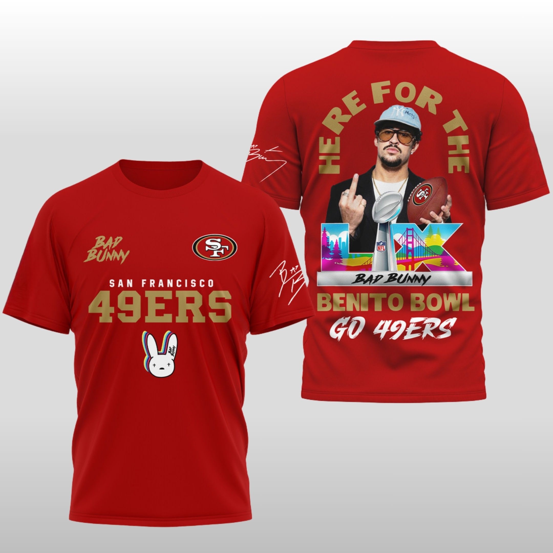 When the biggest stage in football meets the biggest star in music, you get the “Benito Bowl.” This limited-edition shirt captures the swagger of Bad Bunny—complete with his iconic signature style and the “El Conejo Malo” logo—seamlessly blended with the iconic San Francisco 49ers branding.