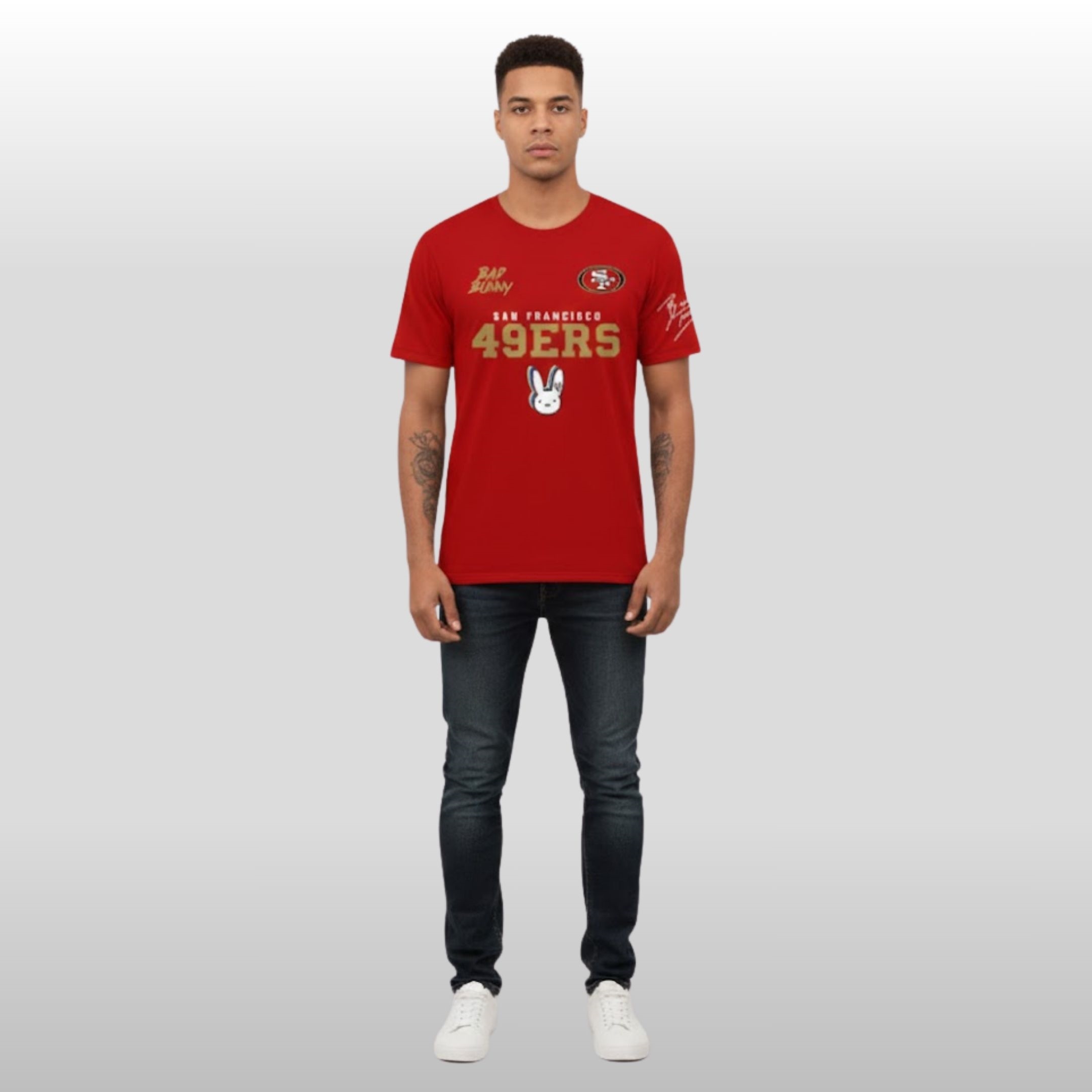 The 49ers have always been about the “Gold Standard,” and Bad Bunny is the gold standard of global music. This shirt is designed for those who lead the pack, blending streetwear aesthetics with die-hard sports fandom.