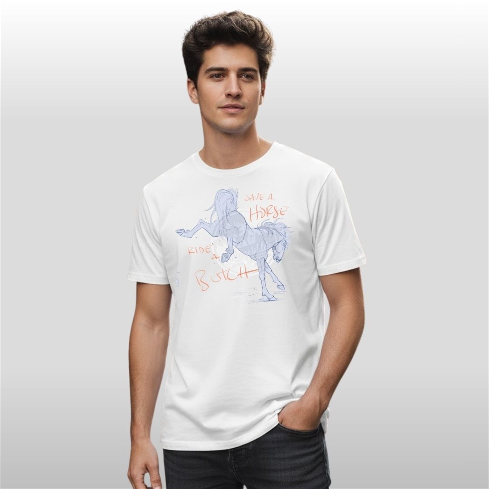 The Save A Horse Ride A Butch Shirt is the ultimate piece for those who appreciate a blend of rustic charm and fierce identity. Crafted on a comfortable, high-quality white shirt, the design features a striking illustration of a rearing horse rendered in cool, ethereal blue-grey lines. Superimposed over this dynamic image, the iconic phrase “Save A Horse Ride A Butch” is scripted in a vibrant, contrasting orange. This bold graphic tee perfectly captures an empowering, playful, and slightly rebellious spirit.