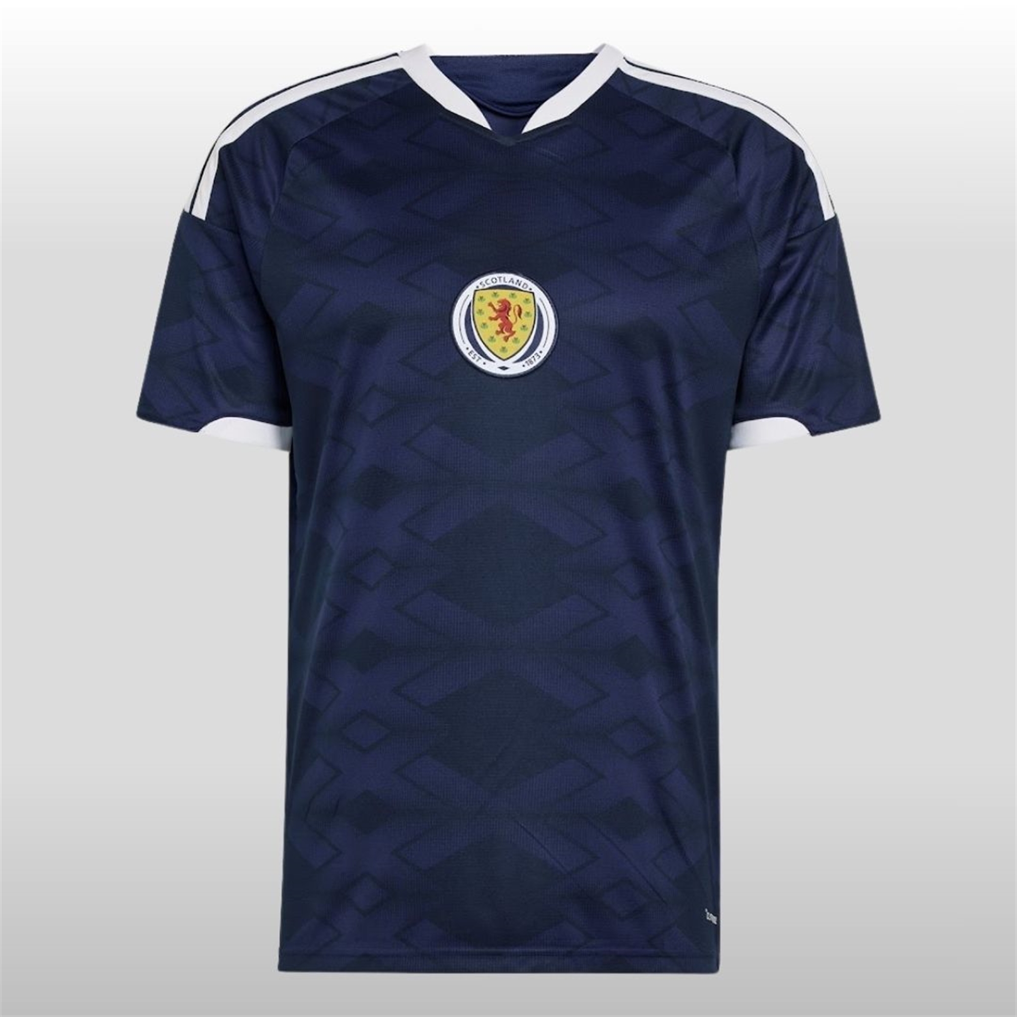 Embrace the spirit of the nation with the stunning new Scotland 2026 World Cup Soccer Jersey. This home shirt is steeped in tradition, featuring a deep, customary navy blue base. The jersey is elegantly detailed with a subtle, tonal diamond-patterned weave that boldly incorporates the iconic St. Andrew’s Cross, a powerful emblem of Scottish heritage. The crest of the Scottish national team is proudly centered on the chest. Striking white detailing highlights the classic V-neck collar and cuffs, along with three signature white stripes adorning the shoulders.