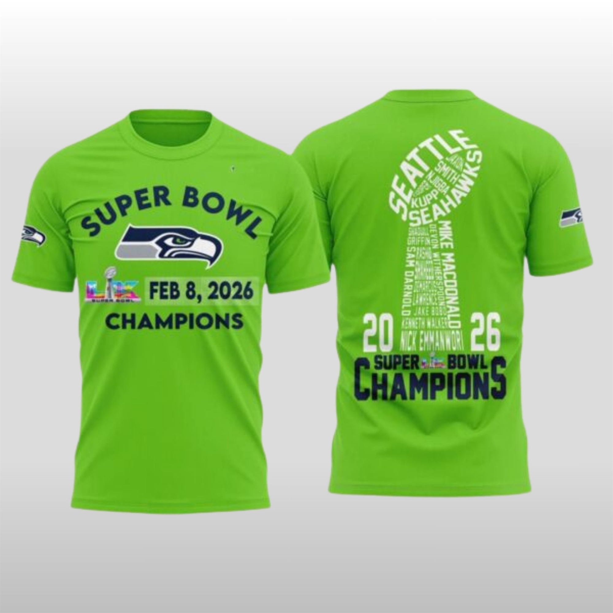 On the reverse, the design takes a creative turn with a custom word-art graphic shaped like the championship trophy. This intricate layout incorporates the names of the core roster and coaching staff—including Mike Macdonald and breakout stars—integrated into a seamless visual narrative. It is a piece of wearable history that captures the exact moment Seattle reclaimed the summit of the sport.