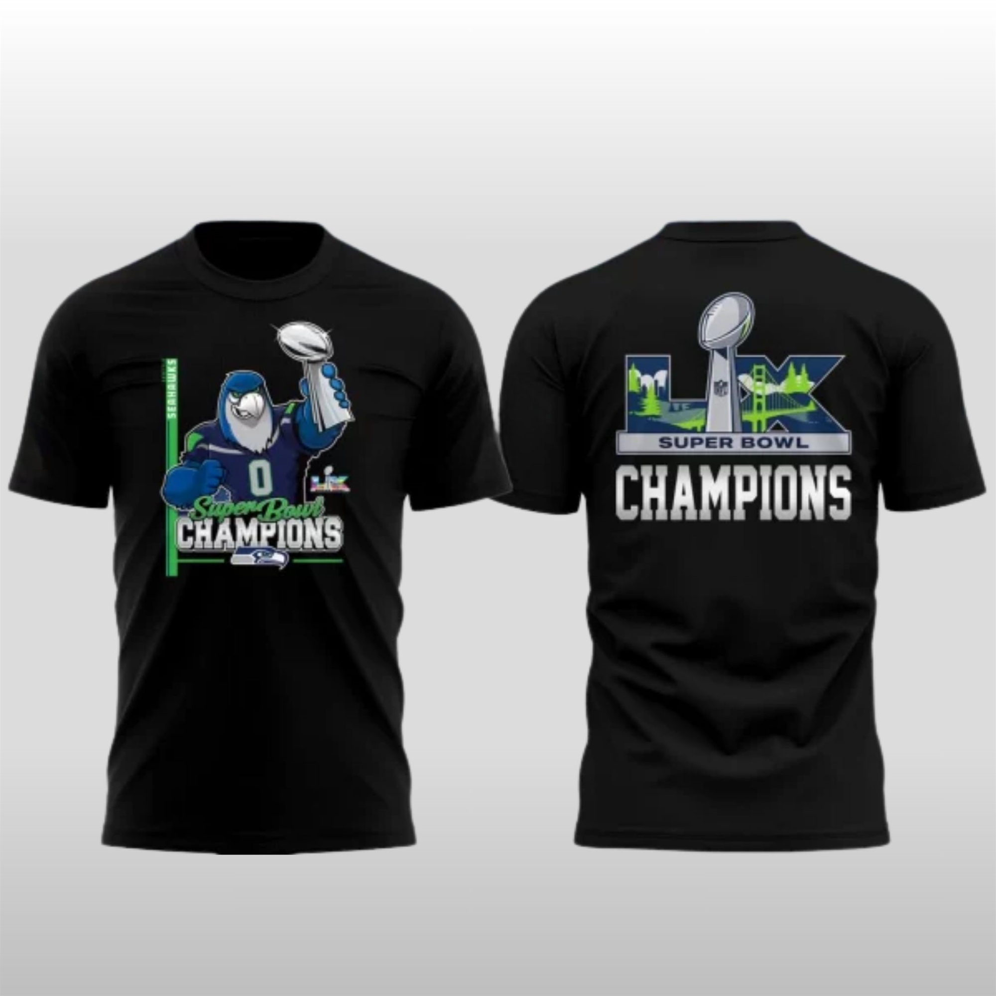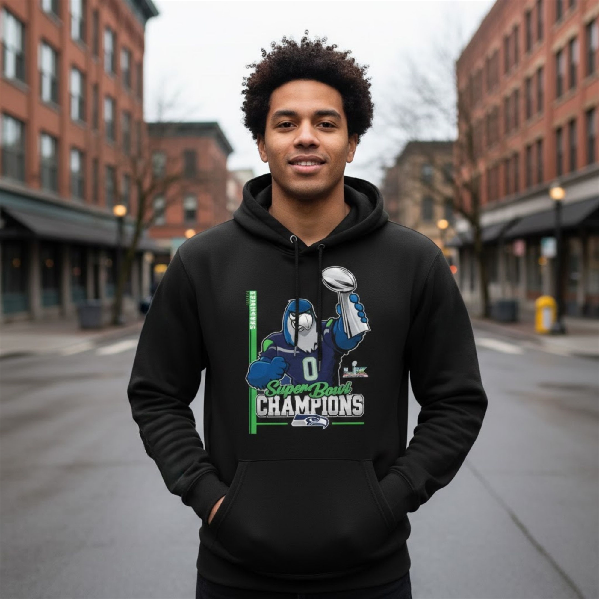 This hoodie is a masterclass in commemorative design. It moves beyond standard fan gear to embrace a sleek, “Championship Midnight” aesthetic. The front features a vibrant graphic of the team mascot triumphantly hoisting the world-renowned silver trophy, set against the team’s signature Action Green accents. The “Super Bowl LX Champions” typography is rendered in a bold, metallic finish that catches the light, mirroring the energy of a stadium under the bright lights.