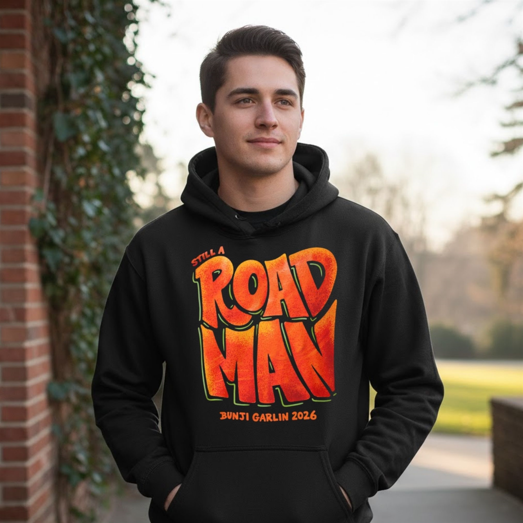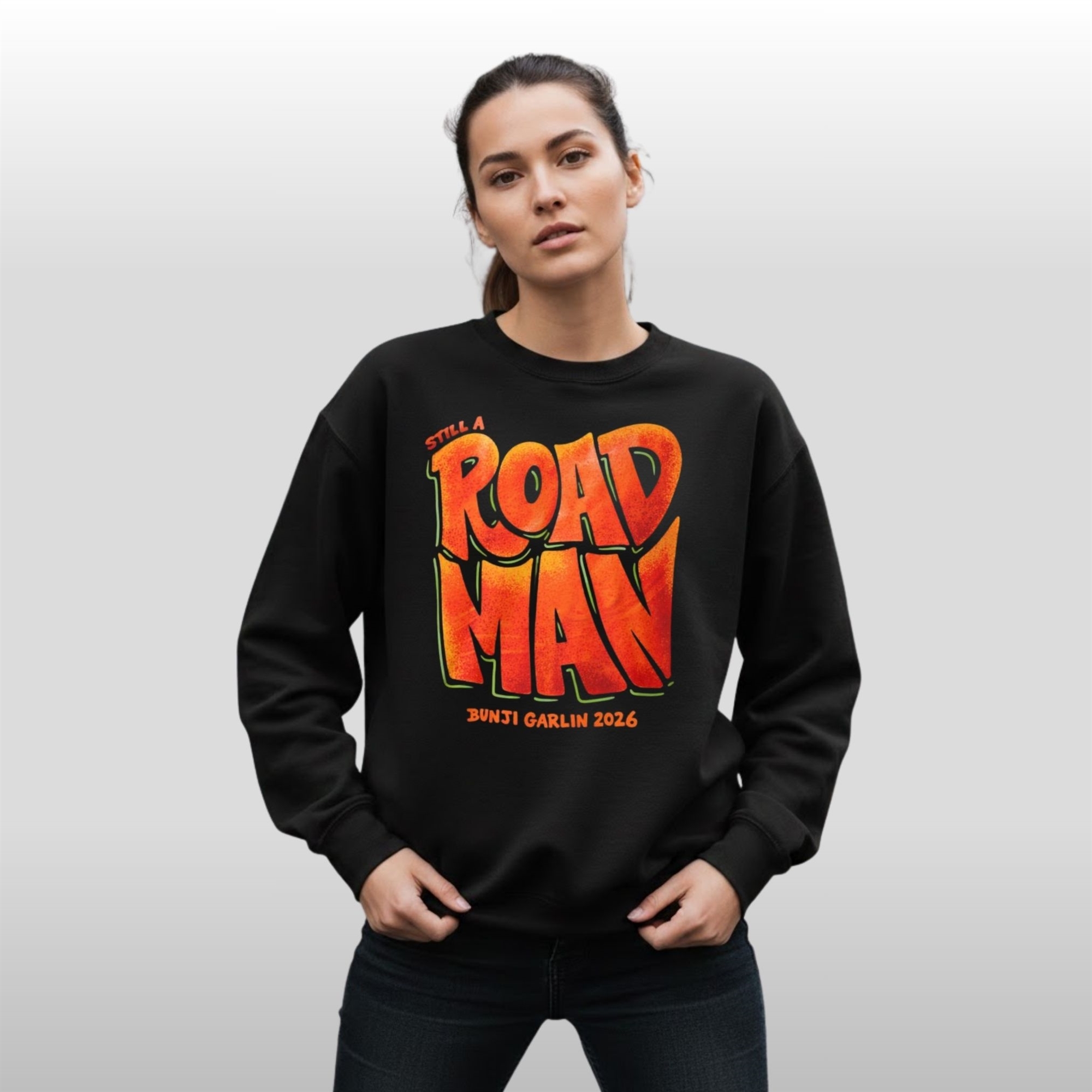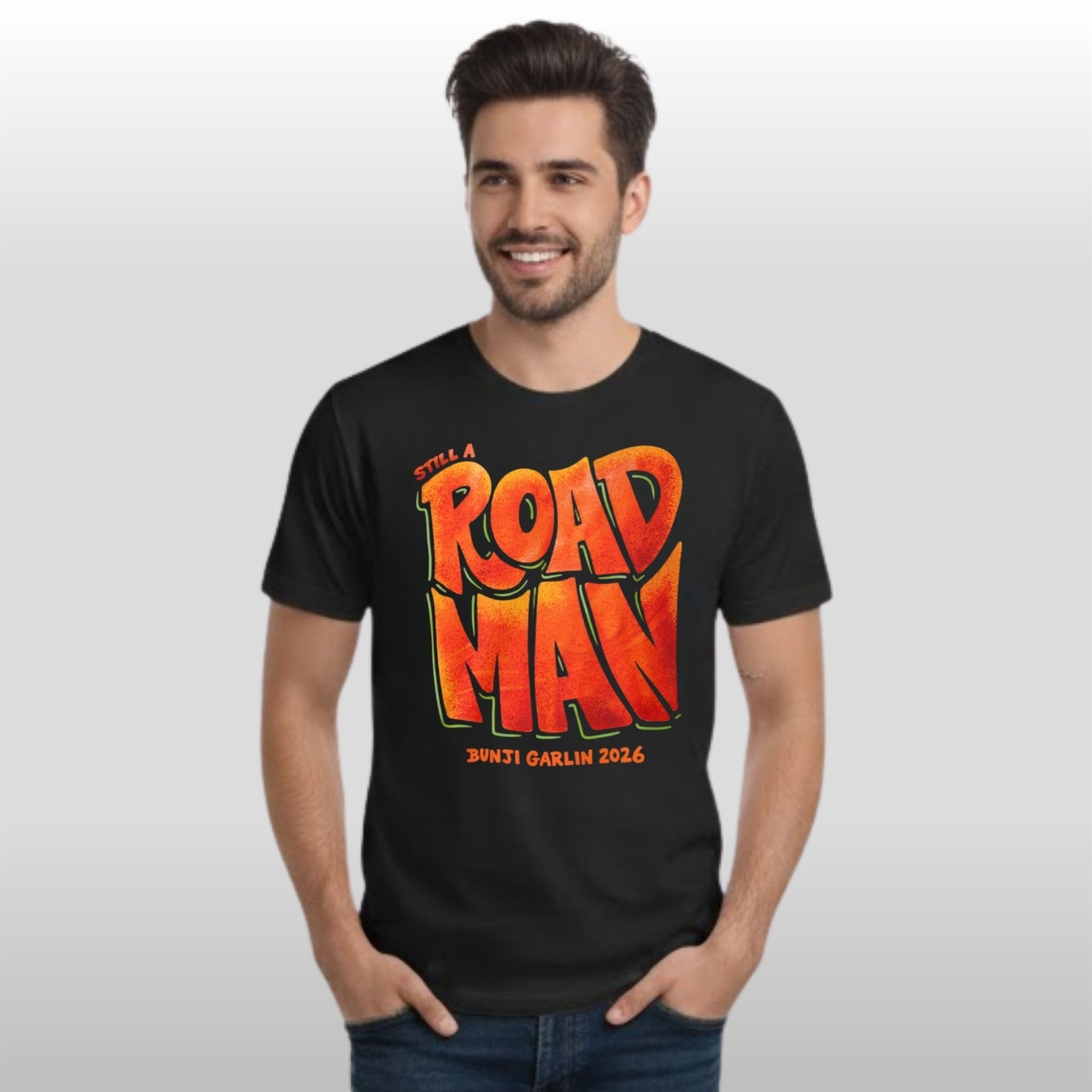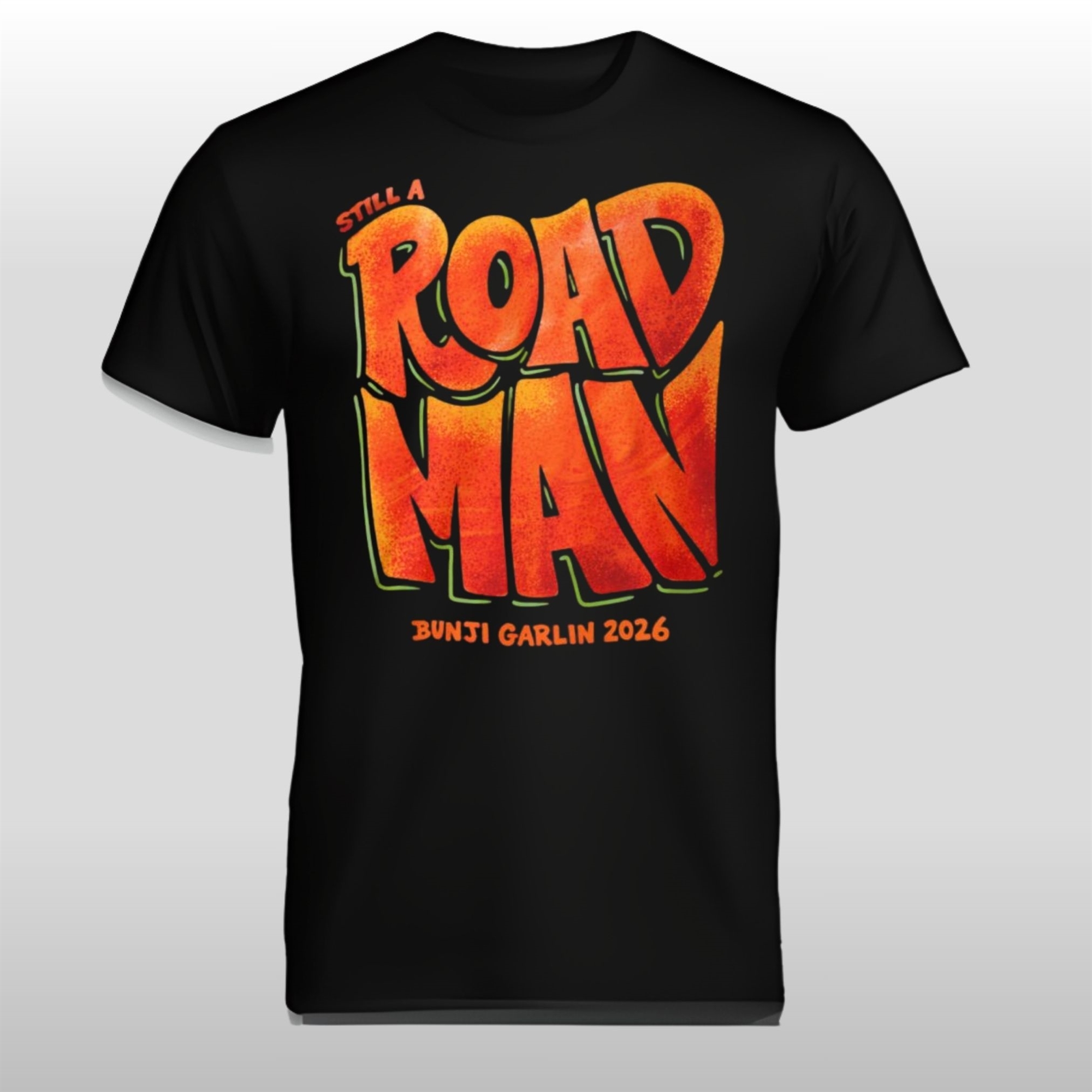 The design of this shirt is a masterclass in Caribbean-inspired street style. Moving away from standard concert merchandise, it features a bold, liquid-style typography that feels alive. The “ROAD MAN” lettering is drenched in a fiery sunset gradient—transitioning from deep reds to electric oranges—evoking the heat of the pavement and the intensity of the festival stage.