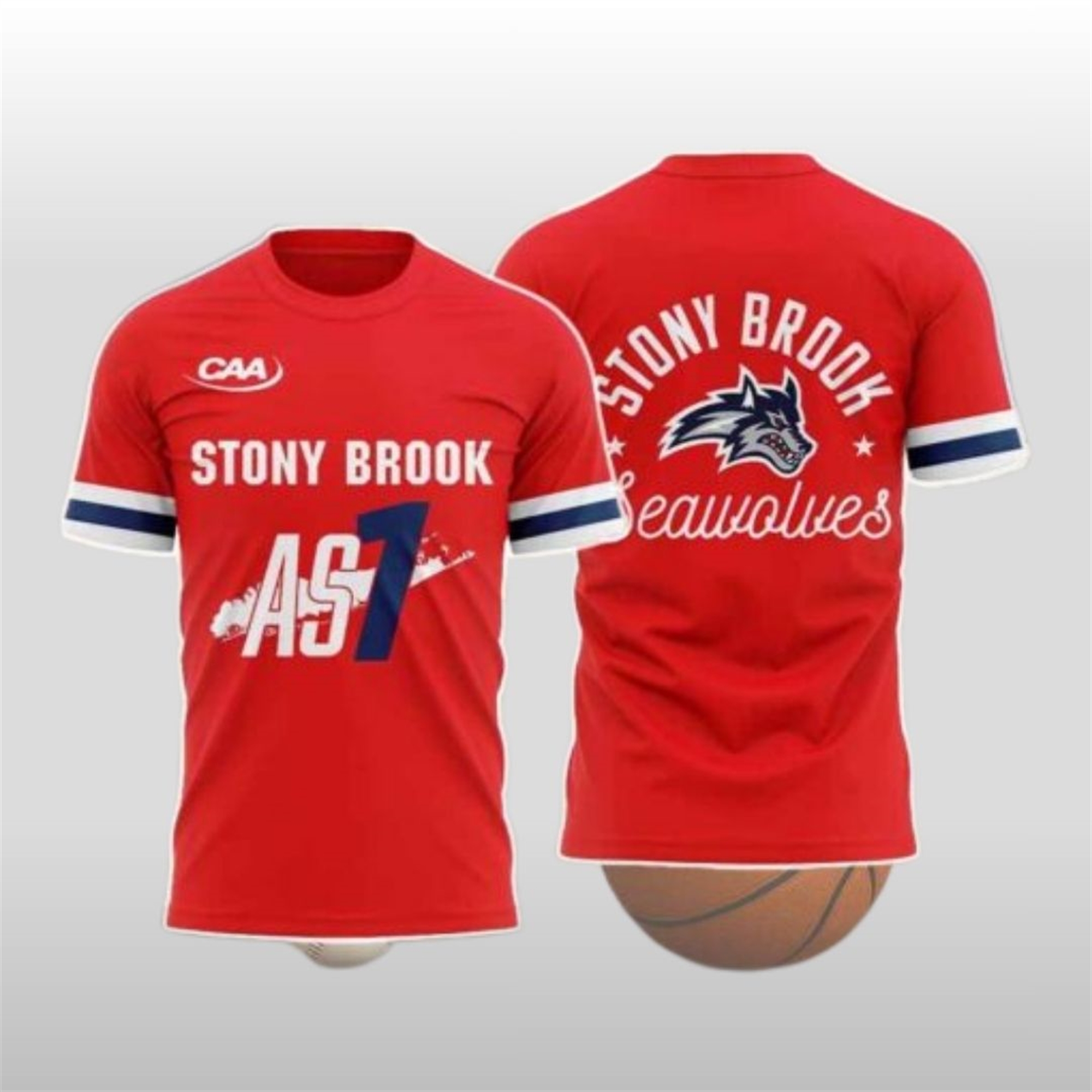 This vibrant, all-red, high-quality fan shirt is the ultimate symbol of Seawolves pride. The front showcases bold white and blue graphics, featuring “STONY BROOK” emblazoned above a striking graphic of Long Island with the letter “A” and the number “S7” overlaid. The “A S7” signifies a collective and enthusiastic support for the team, creating a strong sense of community. On the back, the iconic Seawolves logo—a fierce wolf head—is centered above the flowing text “Seawolves,” all beneath “STONY BROOK.” The white and blue trim on the sleeves adds a crisp, classic collegiate finish.