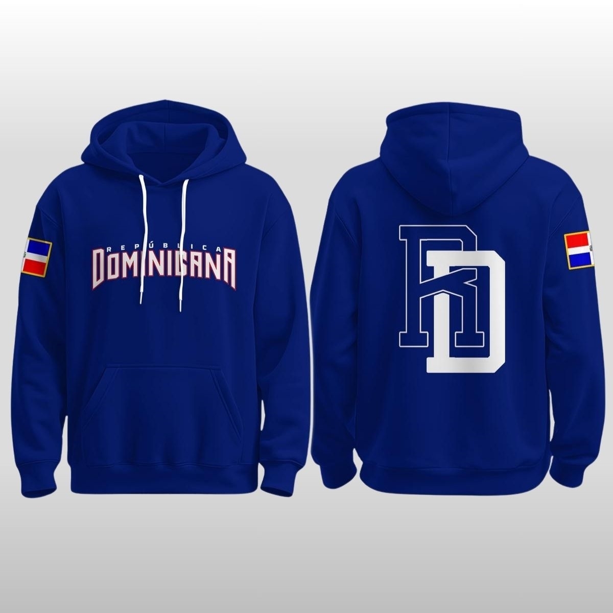 The design is a masterclass in clean, impactful aesthetics. Set against a deep, electric cobalt blue, the hoodie features the “República Dominicana” wordmark arched across the chest in a classic collegiate font. The crisp white lettering, outlined in vibrant red, mirrors the colors of the national flag, creating a visual pop that is impossible to miss.