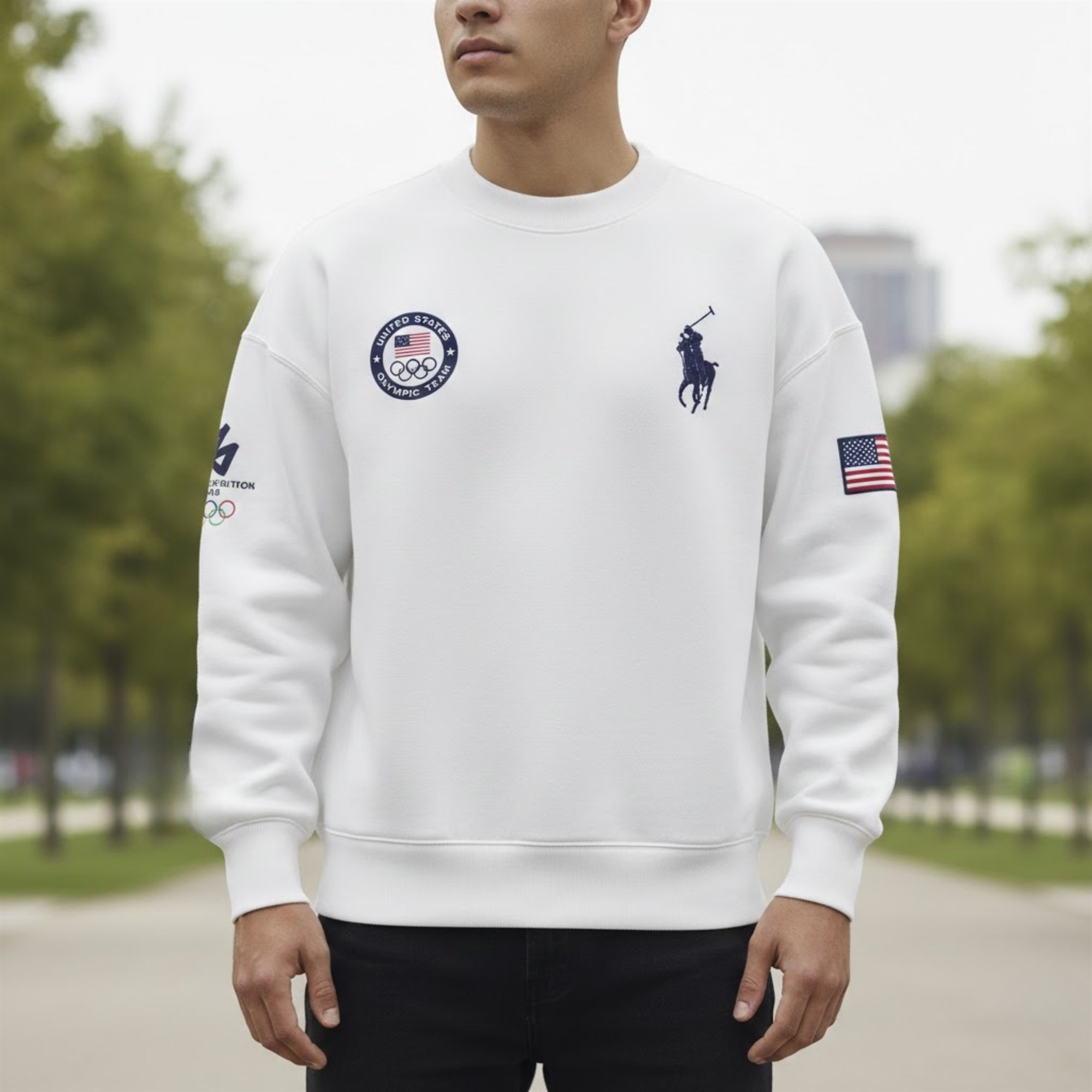 This piece is a masterclass in clean, patriotic design. Moving away from overly busy patterns, it features a crisp, “Snow White” base that allows the iconic red, white, and blue accents to truly shine. The front is anchored by the classic Team USA crest on the chest, balanced perfectly by the legendary polo player motif, signaling a partnership of timeless quality.