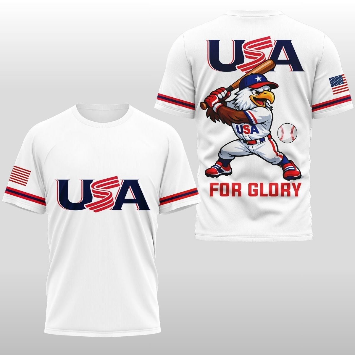 The design is a masterful display of Americana-inspired artistry. Set against a deep, midnight navy base, the shirt features a powerful graphic of a bald eagle—the ultimate symbol of American strength—geared up in full baseball attire and ready to swing for the fences. The word “USA” is boldly emblazoned across the chest and back in a clean, modern typeface, accented by stylized stripes that evoke the motion of a flag waving in the wind. On the sleeves, the American flag and contrasting red-and-white ribbed cuffs add a classic varsity touch that feels both timeless and energetic.