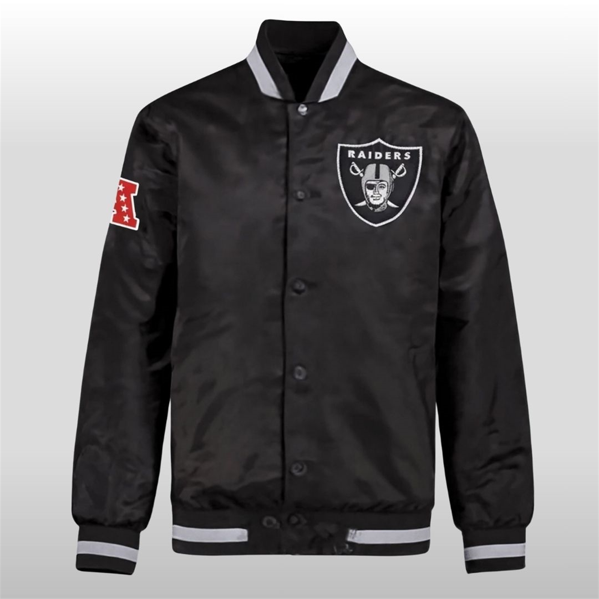 Step into the spotlight with this sleek, black Tom Brady Las Vegas Raiders 2025 Jacket. This satin bomber jacket is designed for both style and comfort, featuring a classic snap-button front and a stand-up collar. The main attraction is the bold, embroidered Raiders shield logo on the chest, a timeless symbol of grit and determination. On the left sleeve, an eye-catching red patch with a distinctive white ‘I’ and surrounding stars adds an element of unique flair, hinting at a new era of Raider legend.