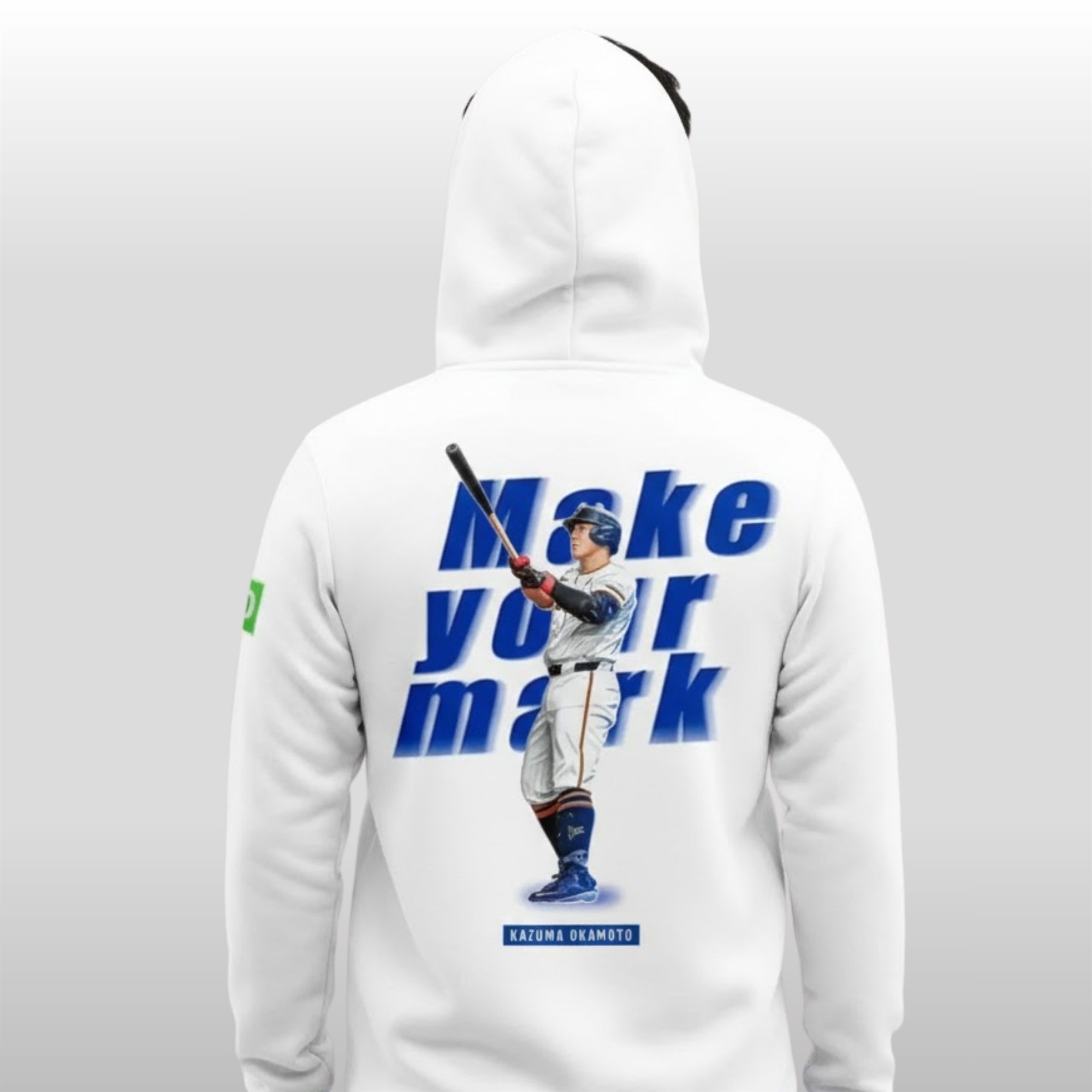 Designed for the die-hard fan who follows the gamea, the back graphic showcases Okamoto’s iconic batting stance against a bold “Make Your Mark” backdrop. Whether you’re cheering from the 100-level or watching the highlights from home, this hoodie represents the international bridge of baseball excellence.