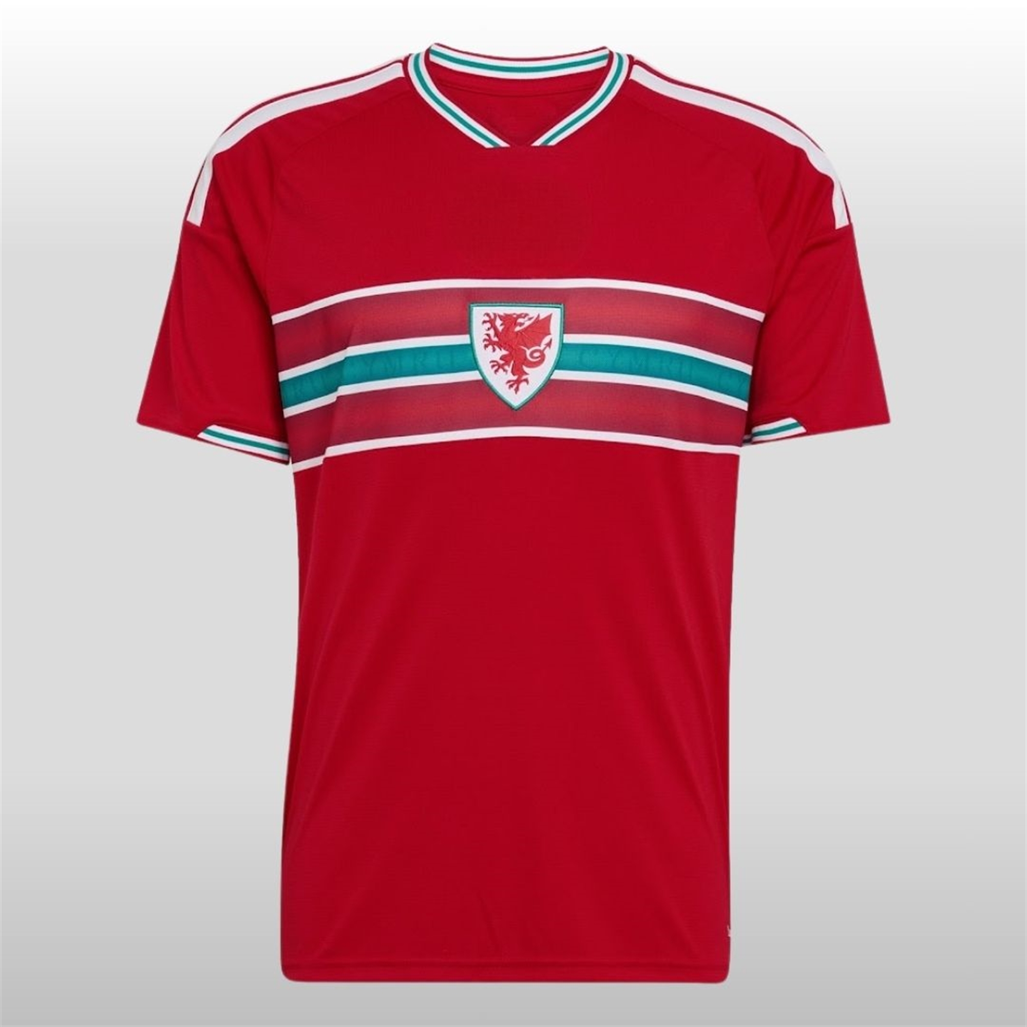 This bold red jersey is a powerful statement of Welsh identity. Dominated by the iconic national color, it features a distinctive teal and white horizontal band across the chest, setting it apart with a modern flair. Right at the heart of the design sits the fierce Ddraig Goch (Red Dragon) crest, beautifully integrated into the stripe. The classic V-neck collar, accented with white and a teal trim, and the clean white shoulder stripes complete the athletic, retro-inspired look.