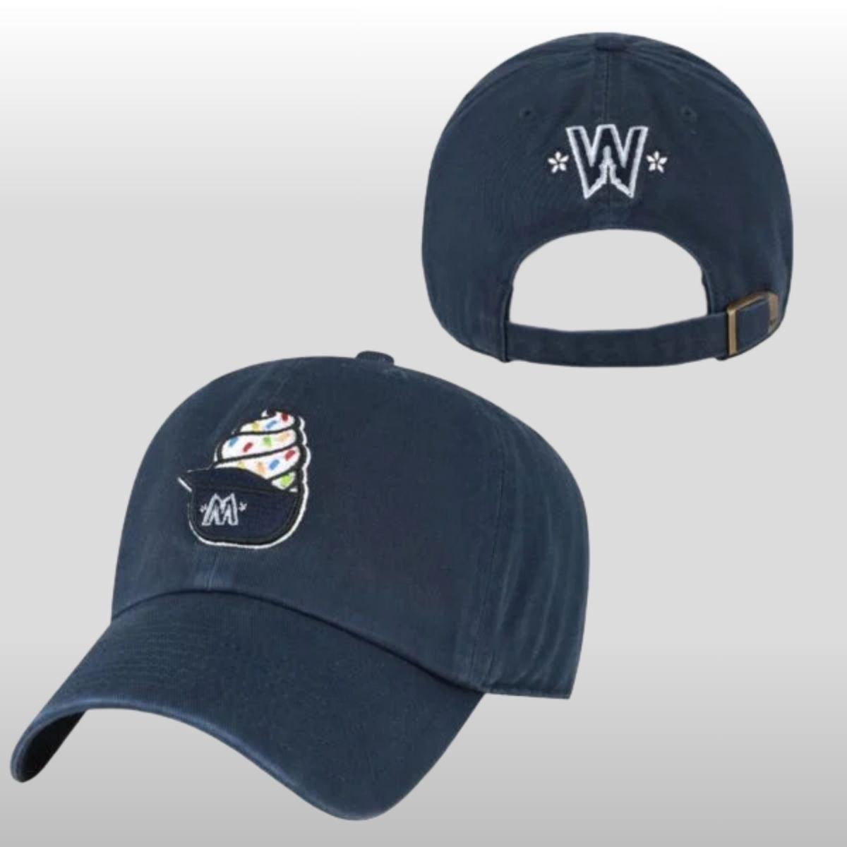 The design of this headwear is a playful departure from traditional athletic gear, drawing heavy inspiration from the beloved cherry blossom aesthetic of the District. The front panel features a meticulously detailed embroidery of a soft-serve ice cream cone, where the “scoop” is a swirl of pastel pink and white, mimicking the delicate petals that line the Tidal Basin. Directly beneath the cone, the iconic “Washington” script is woven in a subtle, creamy off-white thread, blending seamlessly with the waffle-cone texture depicted in the stitching. This imagery is set against a deep navy blue fabric, providing a high-contrast background that makes the confectionery artwork pop.