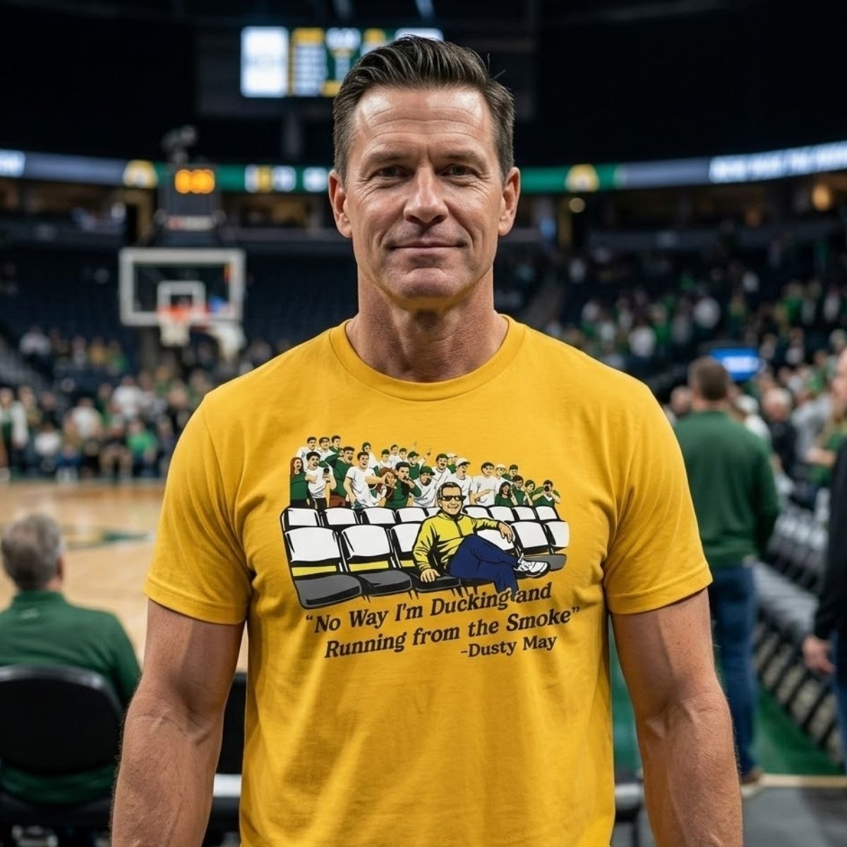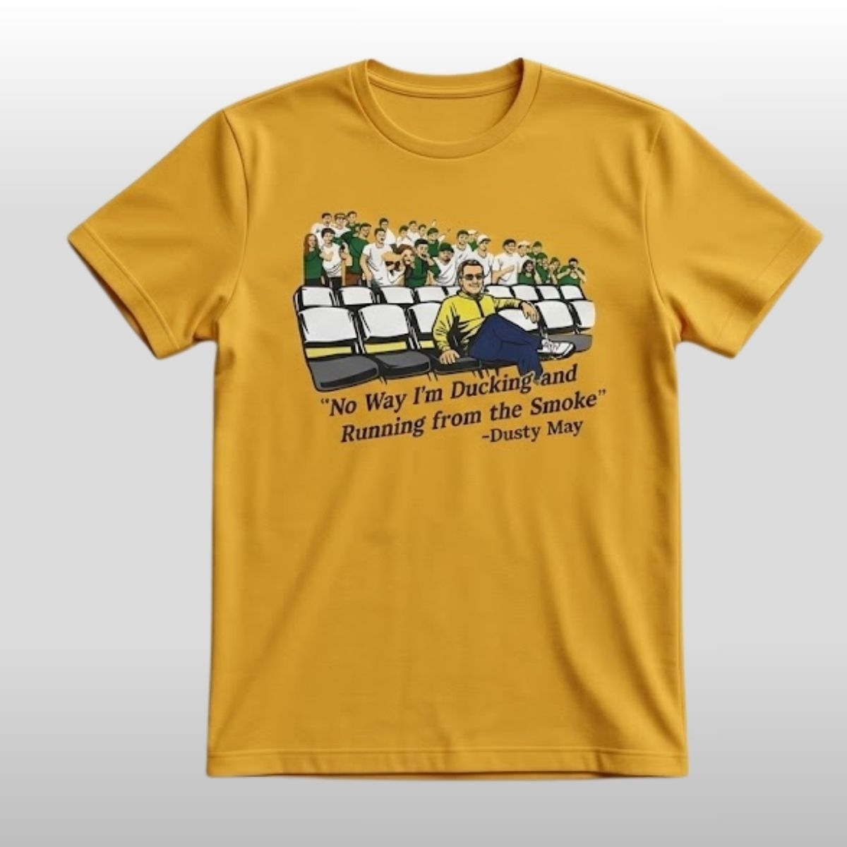 This shirt is a masterclass in storytelling through design. Moving away from standard minimalist graphics, it features a detailed, stylized illustration of Coach Dusty May and the squad, set against a backdrop of empty arena seating that emphasizes the focus and “us against the world” mentality. The centerpiece is the powerful quote: “No Way I’m Ducking and Running from the Smoke,” a phrase that has quickly become a rallying cry for fans who value toughness and accountability.